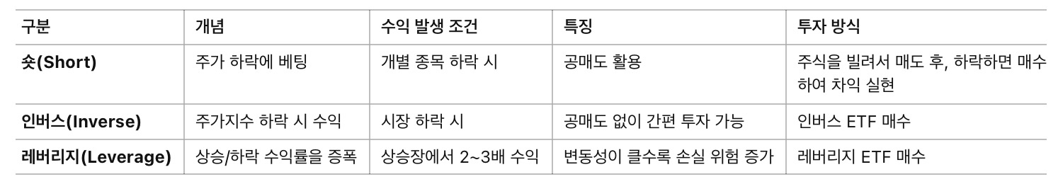 🎯 숏, 인버스, 레버리지 비교 정리